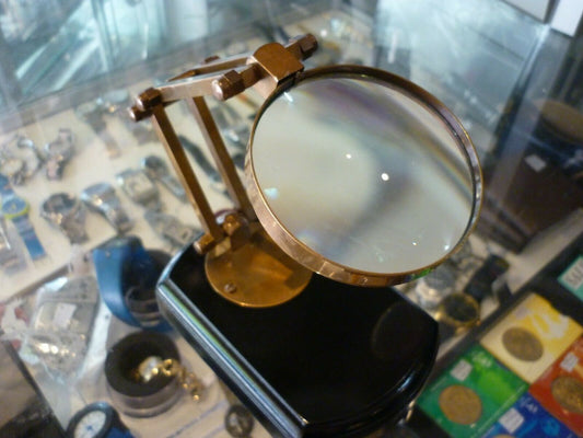 REPLICA VICTORIAN MARINE FOLDING BRASS MAGNIFYING GLASS WOOD BASE / NAUTICAL